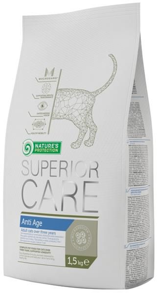 Nature‘s Protection Superior Care Anti Age – speciální krmivo určené kočkám všech plemen nad 3 roky věku. Toto krmivo je navrženo tak, aby splňovalo všechny požadavky na jejich výživu, podpořilo správné dospívání a zabránilo předčasným známkám stárnutí. - vyrobeno z drůbežího masa (kuřecí, krůtí, kachní) vysoké kvality - drůbeží tuk zajišťuje krmivu vynikající chuť i potřebnou energii - díky speciálnímu složení udržuje krmivo zdravé klouby a ideální stav pohybového aparátu - přírodní prebiotika podporují správné trávení - Beta-glukany pro podporu imunity - lososový olej a omega mastné kyseliny zajišťují zdravou kůži a srst - DL-methionin společně s vyváženou kombinací minerálů napomáhá udržovat správné pH moči a předchází tak tvorbě struvitových kamenů v močovém traktu - vyrobeno bez použití pšenice, umělých barviv, ochucovadel a konzervantů Obsahuje specifický nerost "MicroZeoGen” - dynamicky mikronizovaný klinoptilolit, který: - stimuluje zdravou funkci střev a vstřebávání živin - ve střevech zachytává a odstraňuje patogenní bakterie a jejich toxiny - podporuje celkovou pohyblivost kočky díky lubrikaci kloubů - posiluje přirozený obranný systém organismu Složení: Dehydratované drůbeži maso (kuřecí maso 83%, krůtí maso 12%, kachní maso 5%), rýže, kukuřičný lepek, kukuřice, drůbeží tuk, hydrolyzované živočišné bílkoviny, cukrovkové řízky, kvasnic, lososový olej, lněné semeno, dynamicky mikronizovaný klinoptilolit (1%), chlorid sodný, extrakt čekanky, prášek z celých vajec, chlorid draselný, manano-oligosacharidy (MOS), glukosamine (500mg/kg), kvasnice (beta-glukany), sušený květ měsíčku (zdroj luteinu), zelený čaj, chondroitin sulfát (200mg/kg), Doplňkové látky: Nutriční doplňkové látky (v 1 kg): vitamin A (3a672a) 30 000 m.j., vitamin D3 (E671) 1 500 m.j., vitamin E (3a700) 800 mg, vitamin C (3a311) 600 mg, kyselina listová (3a316) 1,2 mg, biotin (3a880) 0,11 mg, niacin (3a314) 59,1 mg, vitamin B6 (3a831) 3,7 mg, vitamin B1 (3a821) 8,3 mg, vitamin B12 0,03 mg, síran železnatý monohydrát (E1) 80 mg, jodičnan vápenatý, bezvodý (3b202) 1,7 mg, síran měďnatý pentahydrát (E4) 6 mg, síran manganatý monohydrát (E5) 25 mg, síran zinečnatý monohydrát (3b605) 145 mg, seleničitan sodný (E8) 0,25 mg, taurin (3a370) 1450 mg, L-karnitin (3a910) 100 mg, DL-methionin (3c301) 5 000 mg. Technologické doplňkové látky: extrakt rozmarýnu, tokoferolové extrakty rostlinných olejů (1b306(i)). Analytické složky: Hrubý protein 32 %, hrubé oleje a tuky 18 %, hrubý popel 8,8 %, hrubá vláknina 1,5 %, vápník 1,2 %, fosfor 0,8 %, draslík 0,8 %, sodík 0,5 %, mastné kyseliny: omega-3 0,34 %, omega-6 2,82 %. Dávkování: Doporučená denní krmná dávka hmotnost množství 3 kg 42-56 g 4 kg 51-67 g 5 kg 59-78 g 6 kg 66-88 g 7 kg 74-98 g 8 kg 80-107 g 9 kg 87-116 g 10 kg 93-125 g