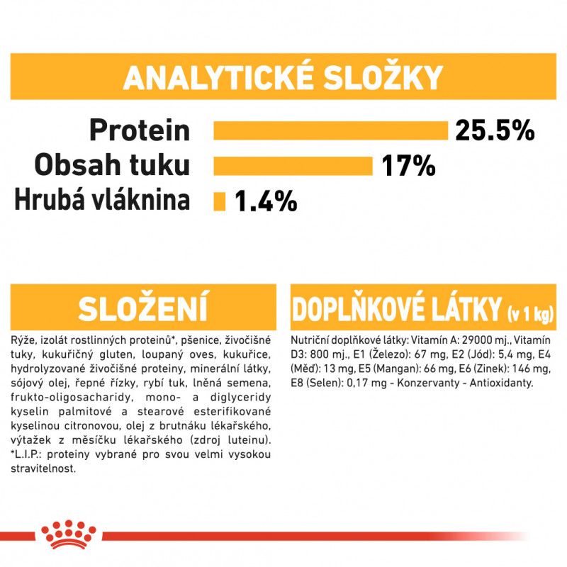 Krmivo ROYAL CANIN® Dermacomfort Mini se sníženým obsahem alergenů je pečlivě připravováno za použití speciálně vybrané řady bílkovin. Tato speciálně upravená výživa pomáhá udržovat pokožku vašeho psa v co nejlepším stavu. Také pomáhá udržovat srst hustou a zdravou. Granule pro psy ROYAL CANIN® Dermacomfort Mini, vhodné pro psy do 10 kg, obsahují pečlivě navržené granule, které dokonale vyhovují zubům vašeho psa. Obsahuje mastné kyseliny omega 3 a omega 6, včetně kyselin GLA, EPA a DHA, které podporují a vyživují kůži, jež je díky tomu méně citlivá na dráždivé látky v okolním prostředí.
