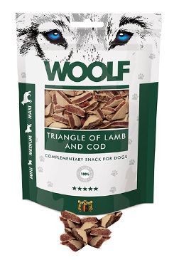 Masový měkčený pamlsek z jehněčího masa s treskou ve tvaru trojúhelníčku je vhodný pro malá a střední plemena psů.